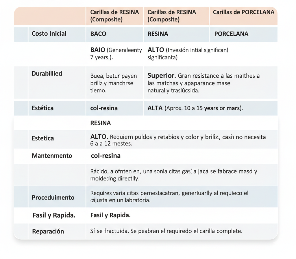 Resina: más económica, resultado en 1 sesión, ideal para correcciones rápidas. Porcelana: inversión mayor, mejor durabilidad y estética superior.