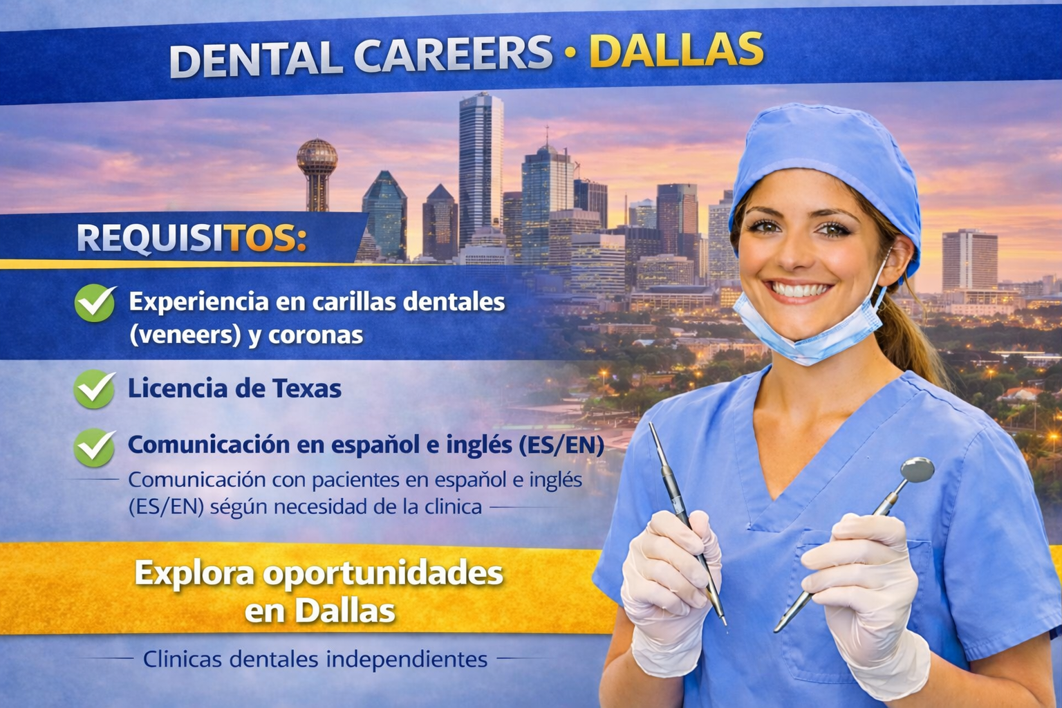 Specialized hub connecting professionals with independent cosmetic dental clinics in Dallas. Focus on veneers, crowns, and bilingual (Spanish/English) patient care.